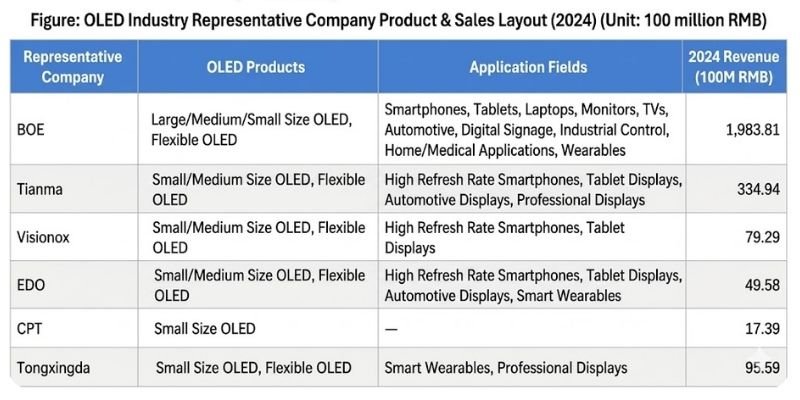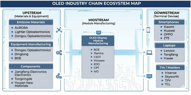 Upstream players include specialized firms such as Aoled, Light Grade, and Tunghsu Optoelectronic, which provide the essential building blocks. The midstream is dominated by industry giants, including BOE, Tianma, and CSOT, who manage the capital-intensive panel manufacturing process.