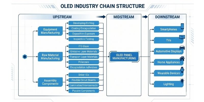 The OLED industry structure is divided into three distinct segments: upstream, midstream, and downstream. The upstream segment involves the production of precision manufacturing equipment, high-purity organic materials, and assembly components. Midstream operations focus on the high-tech process of OLED panel fabrication, while the downstream encompasses the wide array of terminal applications that bring the technology to consumers and industries.