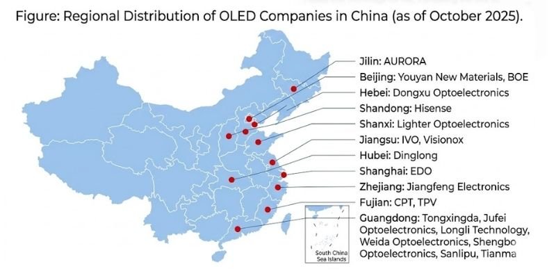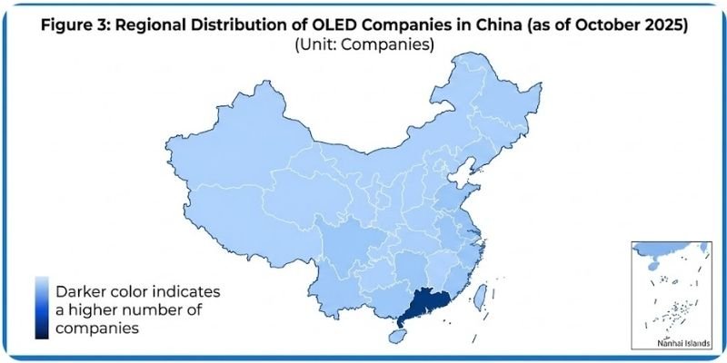 Data reveals that OLED manufacturing and R&D are highly concentrated in specific industrial corridors. According to recent enterprise data, Guangdong Province serves as the primary epicenter, hosting over 2,100 OLED-related enterprises as of late 2025. Jiangsu follows as a secondary hub with over 400 specialized firms.